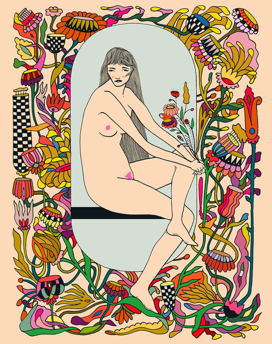 With sheets of velvety hues, ornate designs, and expressive figurative elements, her work is focused on creating striking images that showcase the modern woman, dotted with botany and psychedelia.