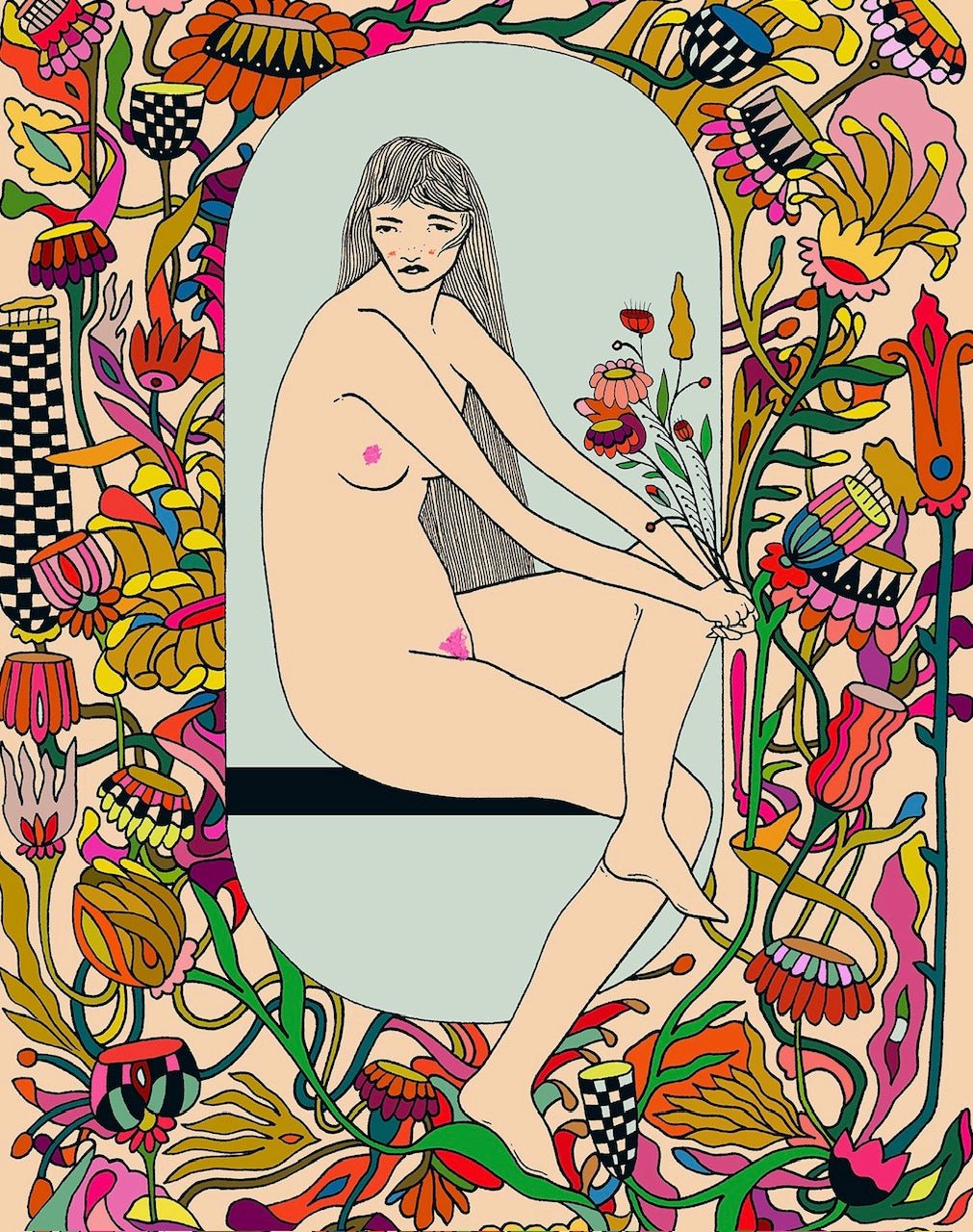 With sheets of velvety hues, ornate designs, and expressive figurative elements, her work is focused on creating striking images that showcase the modern woman, dotted with botany and psychedelia.